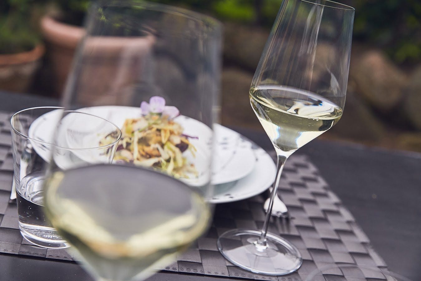 For the second course, though, things change: “continuing with a structured white wine for the fish dish”.
